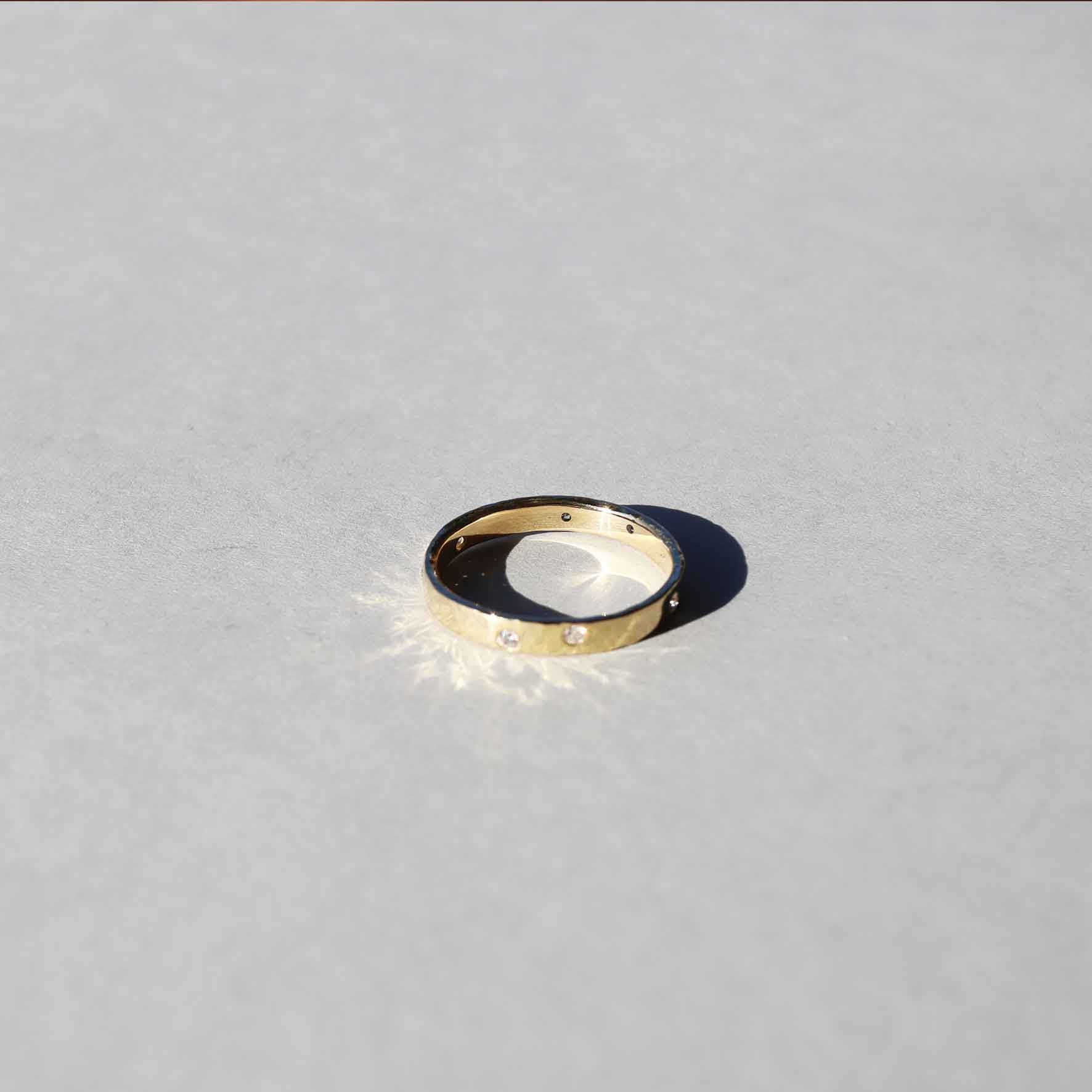 redesign using existing diamonds into a modern ring with a structured form and flush setting